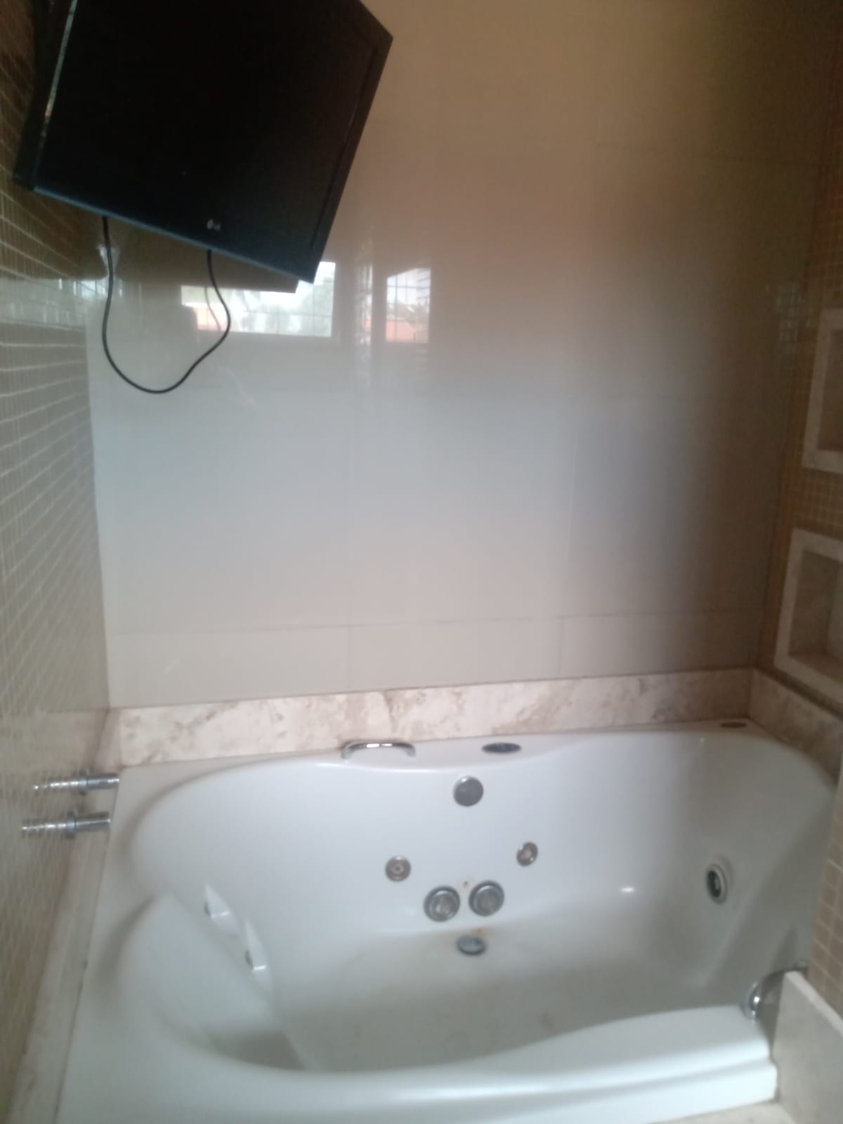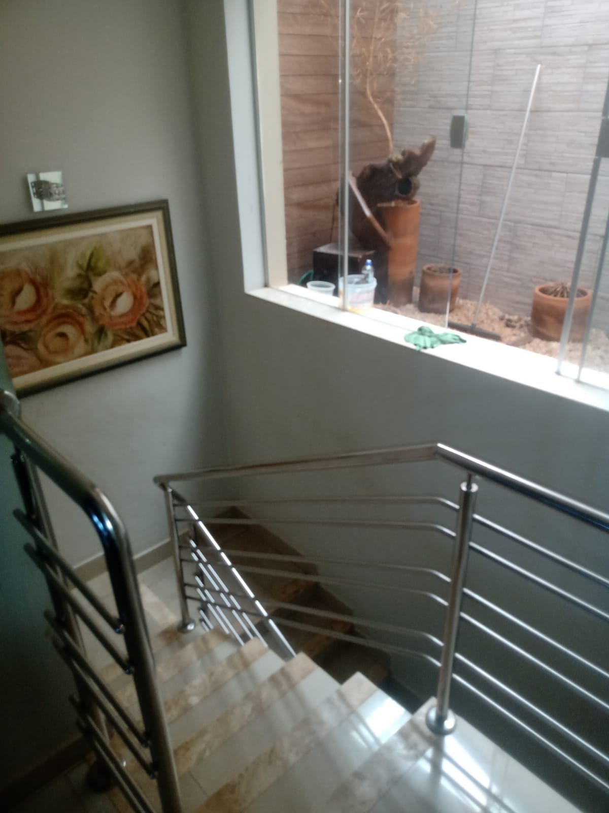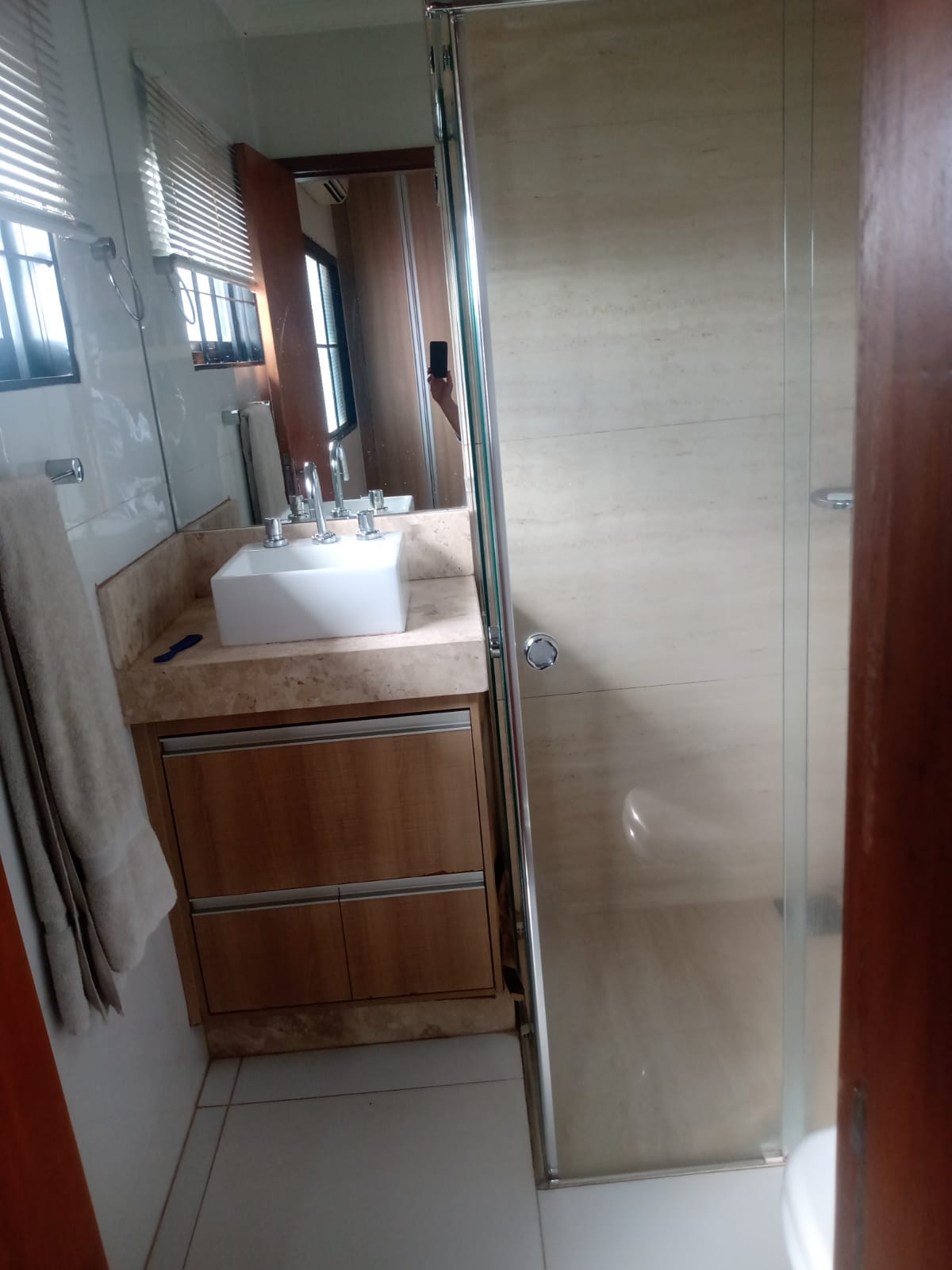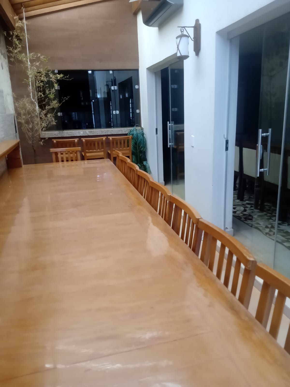 Sobrado parte superior com: 04 suítes sendo 01 com Closet e banheira de hidromassagem, 02 salas de estar conjugadas, sala de tv com sacada, escritório, jardim de inverno e wc social. Parte inferior com: hall de entrada, lavabo, sala de estar, elevador, acesso a escada, sala de jantar, cozinha, área externa com pergolado e lavabo, área de serviço e pequeno quintal, 02 garagens separadas com capacidade para 01 automóvel cada, pintura látex, quintal calçado, teto laje, murada.
