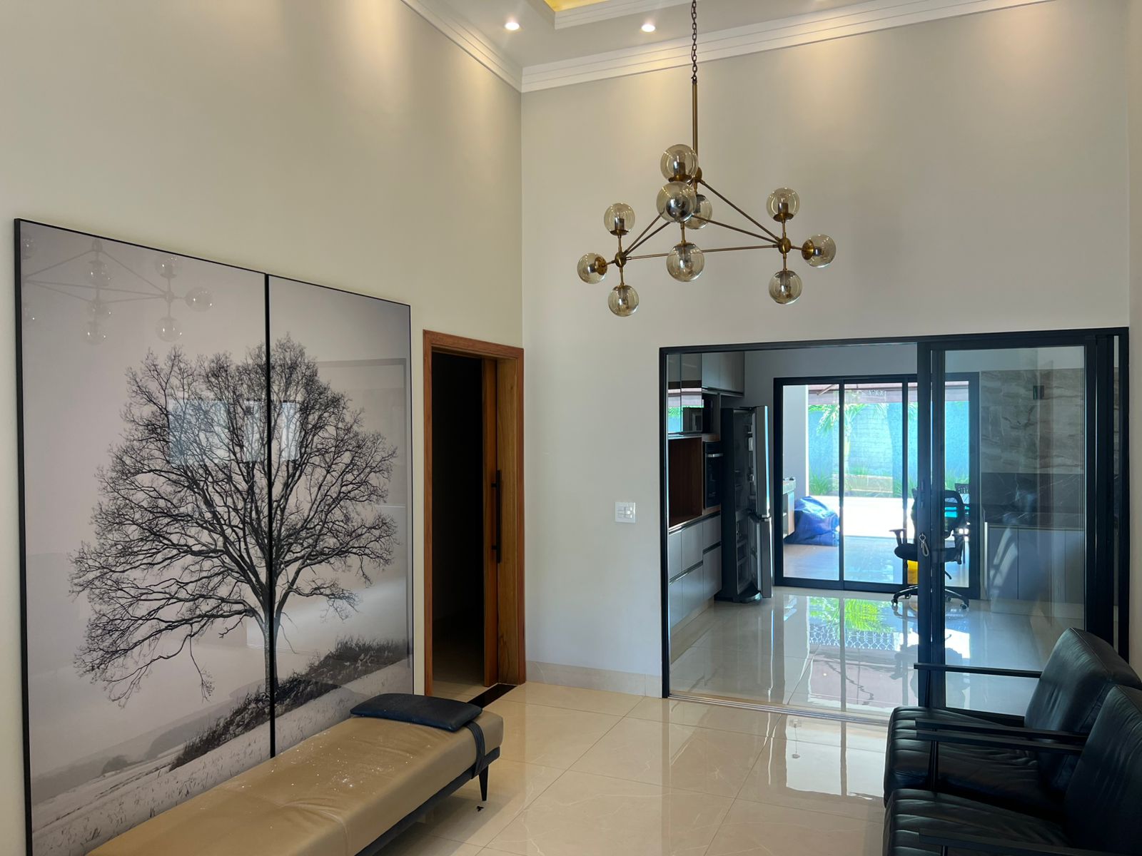 A imponente sala de estar com pé direito alto encanta com sua iluminação natural e uma vista deslumbrante para uma arvore imponente, criando um cenário de conexão com a natureza.