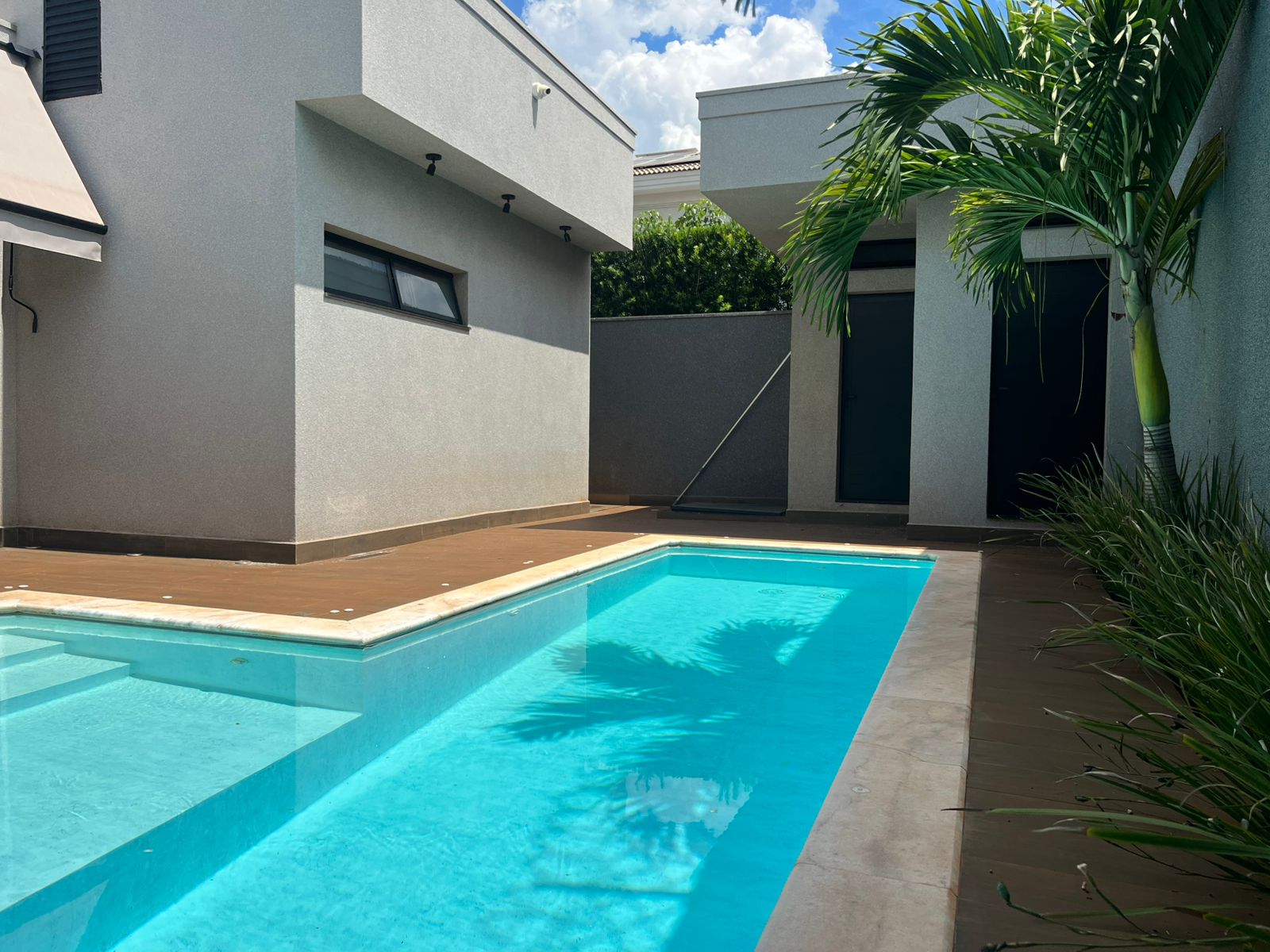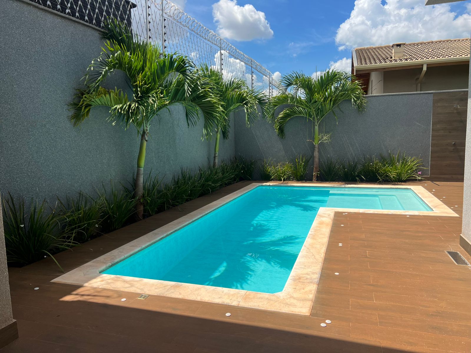Uma piscina grande convida ao relaxamento, cercada por jardins com irrigação automatizada, criando um ambiente exuberante e de baixa manutenção.