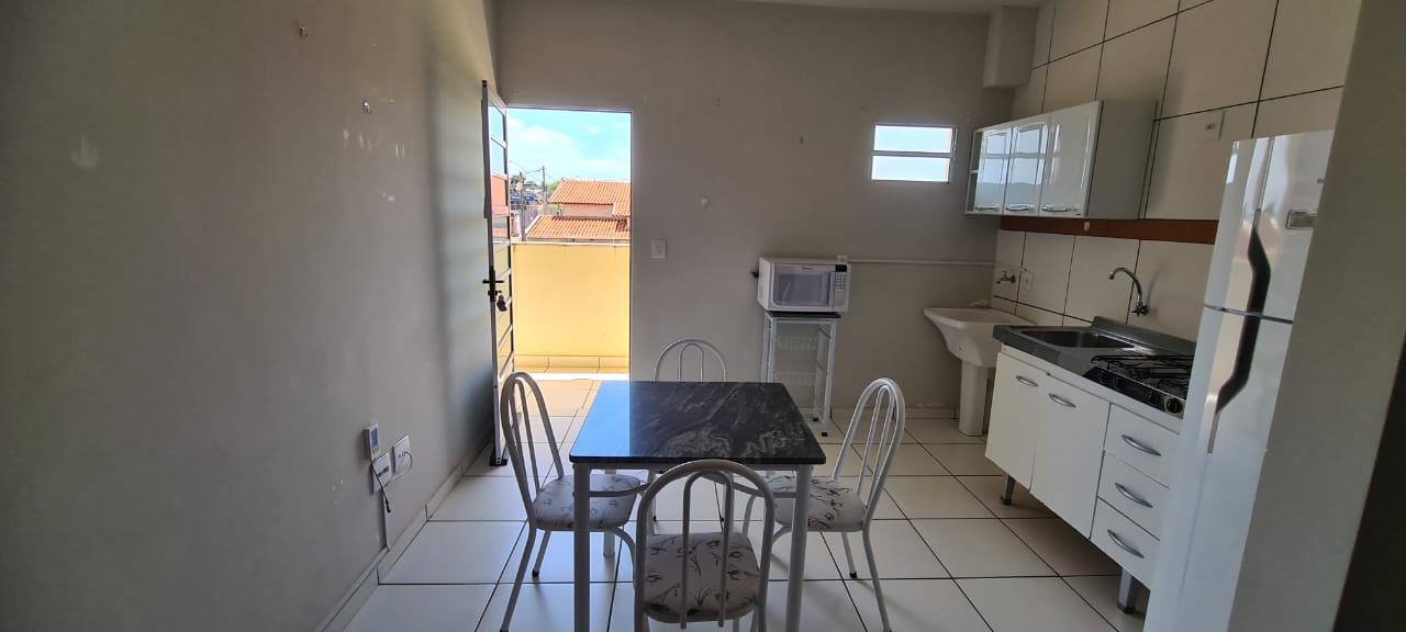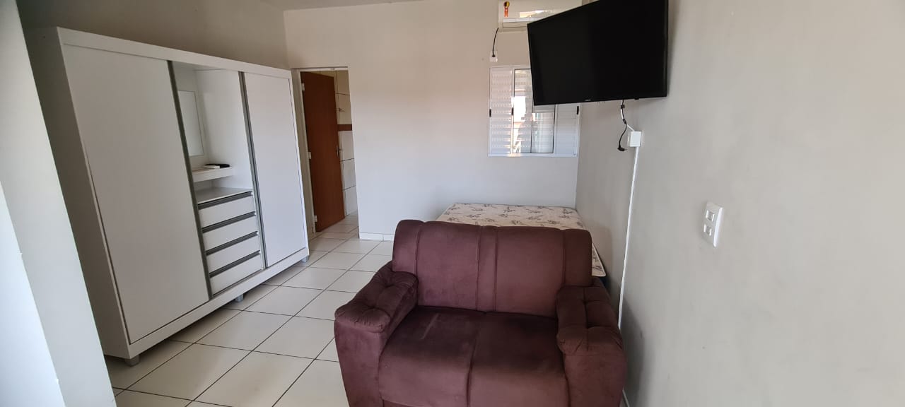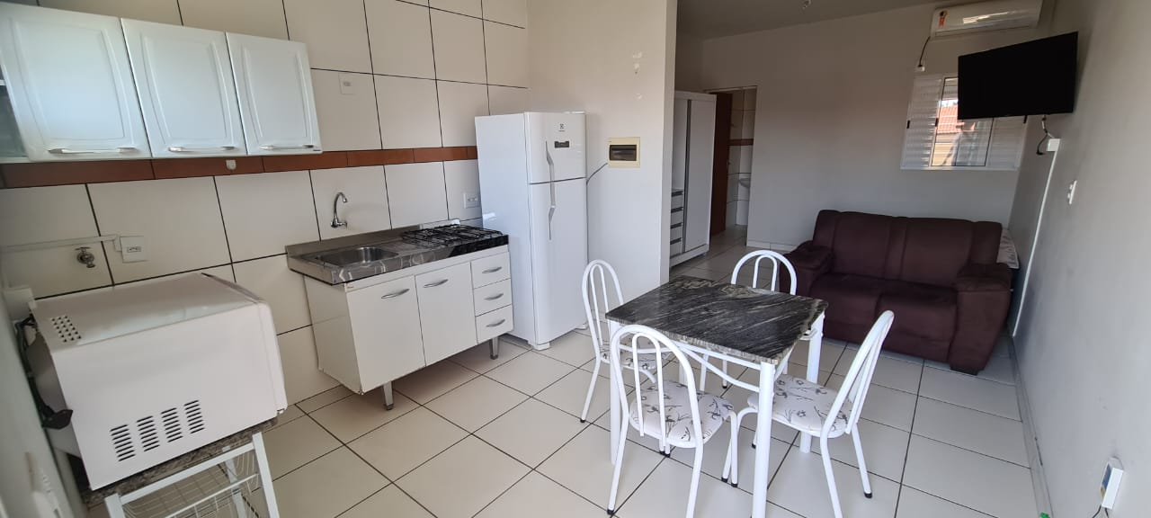 Kitnet com 01 dormitório com AE e AR condicionado, cozinha / area de serviço, wc social, garagem, pintura látex, quintal calçado, teto laje, piso frio, portas em ferro e madeira, janelas em ferro, murada.