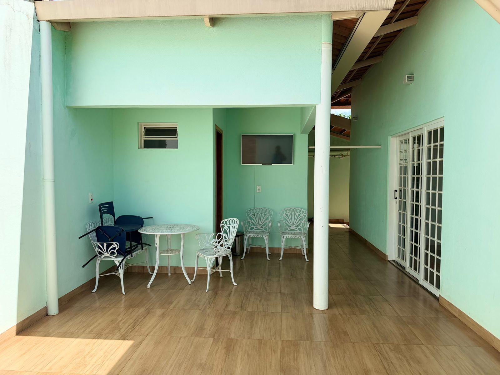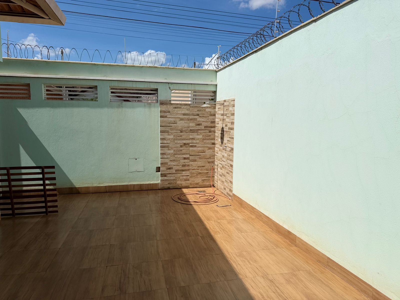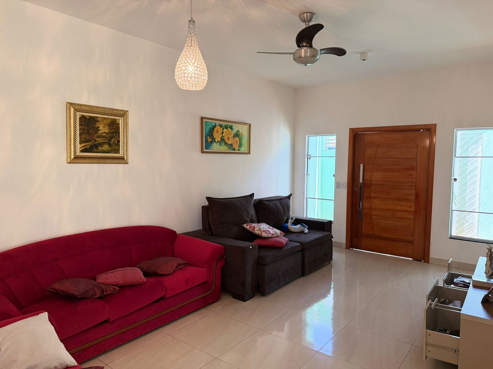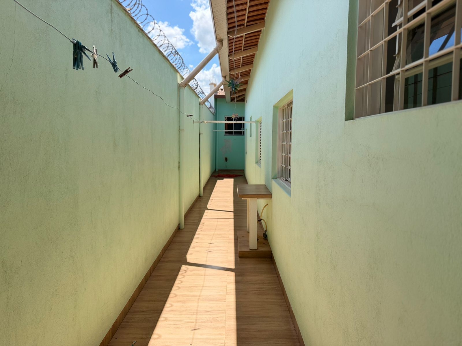 Casa com 01 suíte, 02 dormitórios com AE, sala de tv, copa, cozinha planejada, wc social, wc externo, área de serviço, garagem, pintura látex, quintal calçado, teto laje, piso frio, portas em ferro e madeira, janelas em ferro, murada.