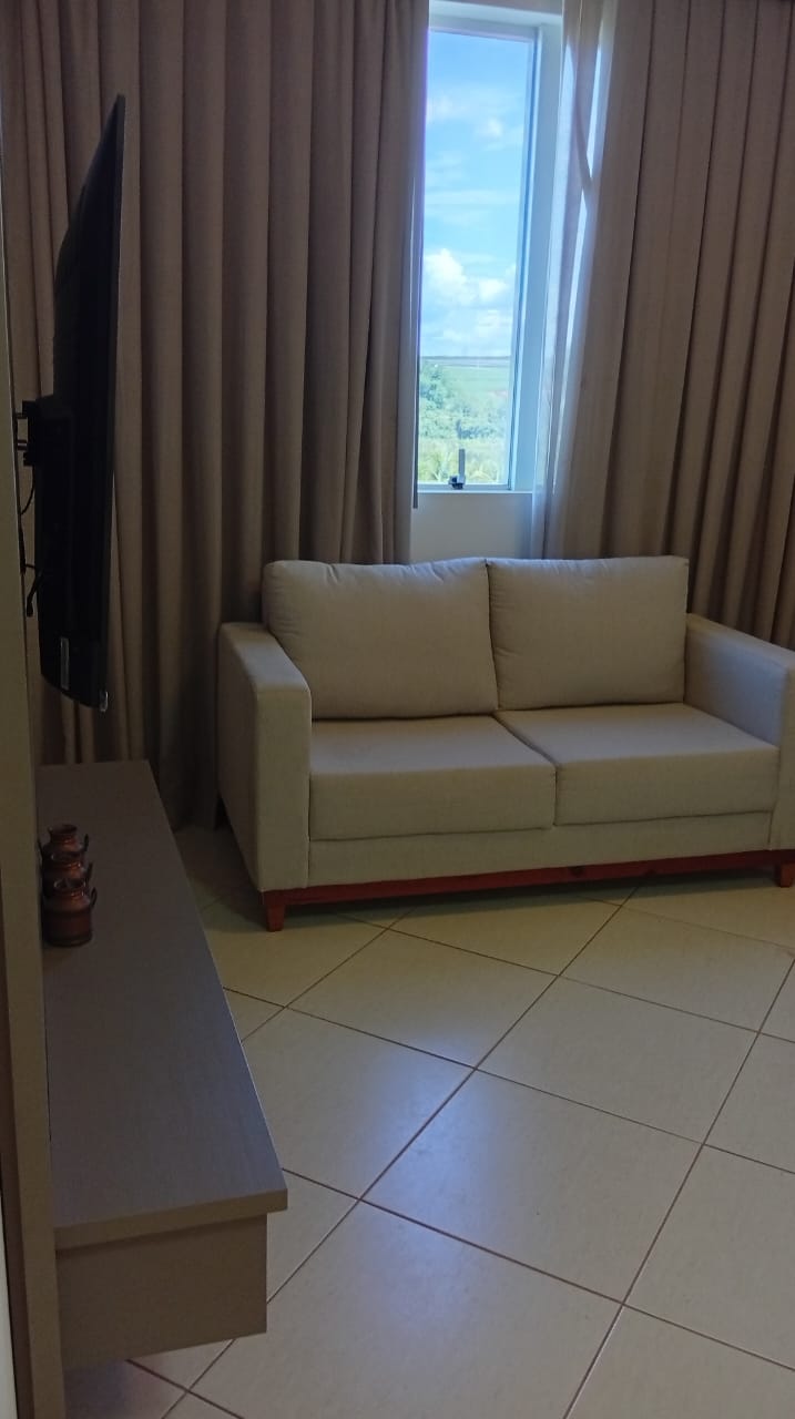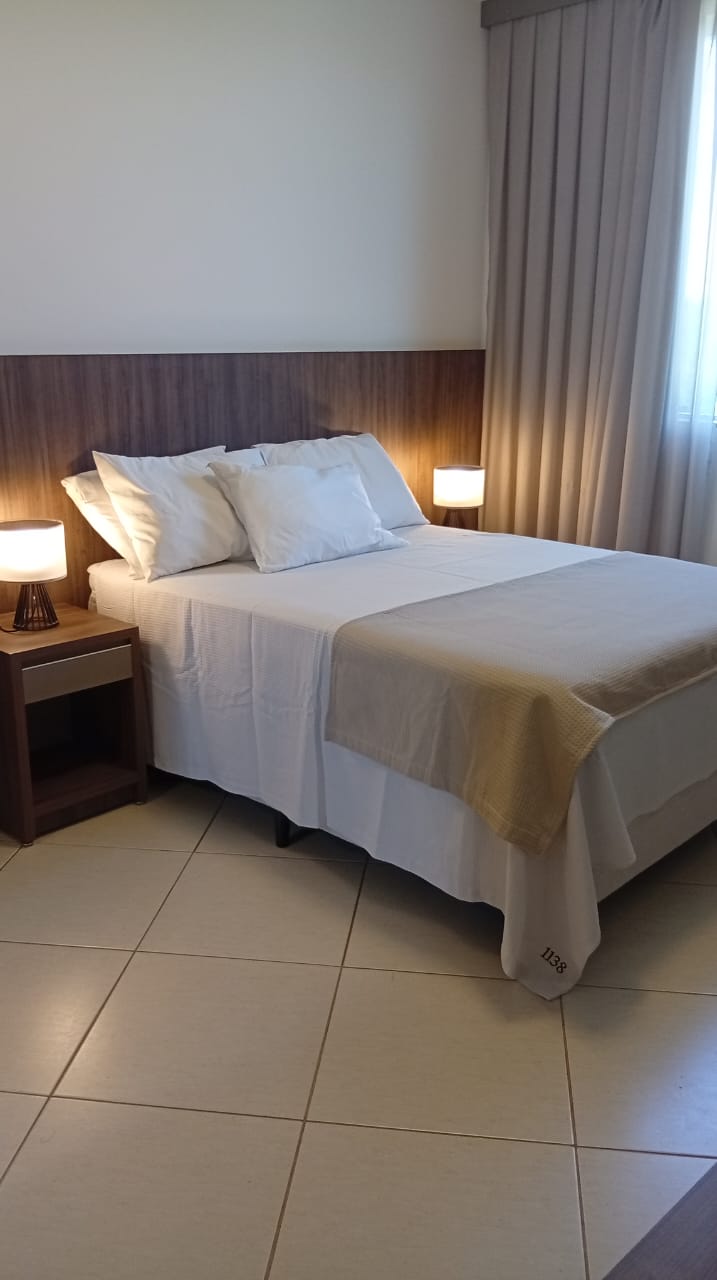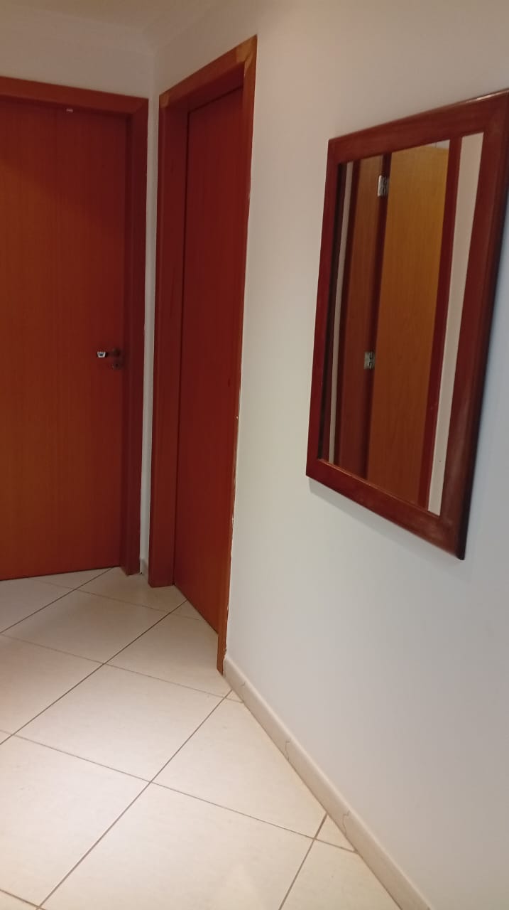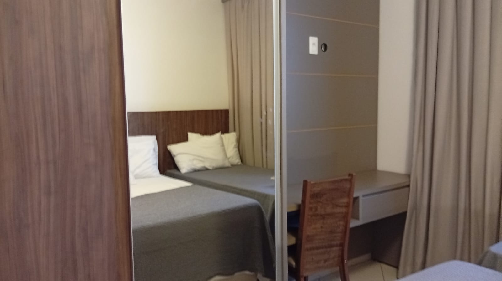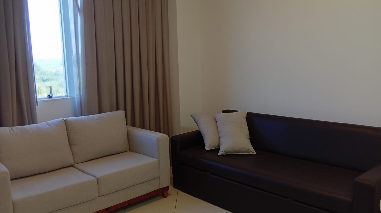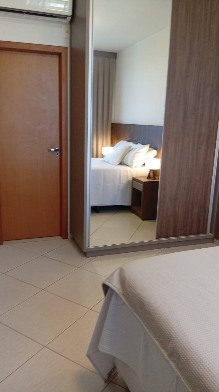 Apartamento com 01 suíte com AE e AR condicionado, bancada para computador, tv de 32 polegadas, cama de casal, 2 criados mudos, abajur, armário de 2 portas com espelho até o teto, 01 dormitório com AE, bancada para computador e tv, cama de casal, 04 colchões de solteiro, cortina com forro, sala com AR condicionado, sofá cama, sofá 02 lugares, cortina com forro, cozinha planejada, mesa com 06 cadeiras, fogão elétrico 02 bocas, geladeira, micro-ondas, pratos, talheres, copos, lixo, wc social com box e espelho, lavanderia, garagem, pintura látex, quintal calçado, teto laje, portas de madeira, janelas em alumínio, murada.