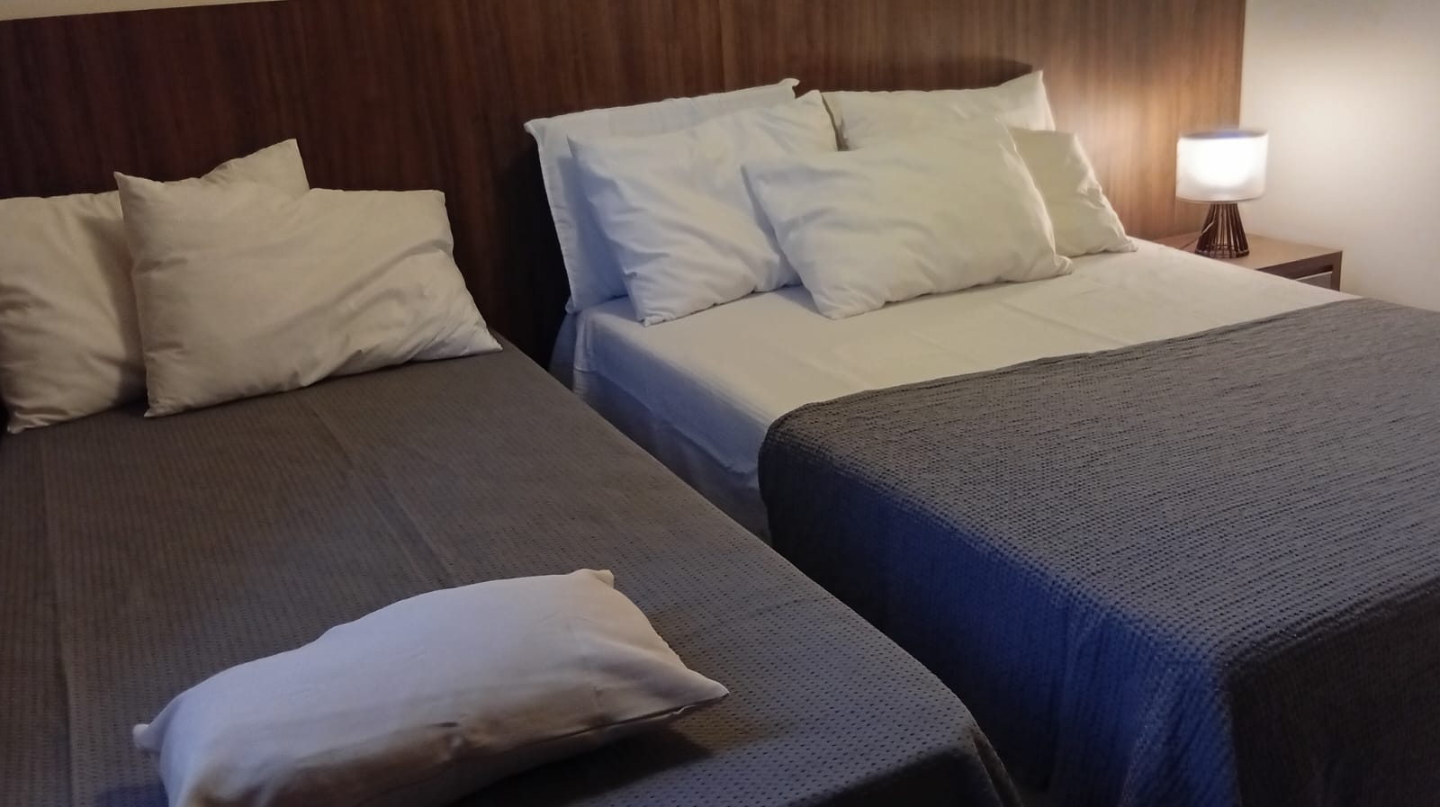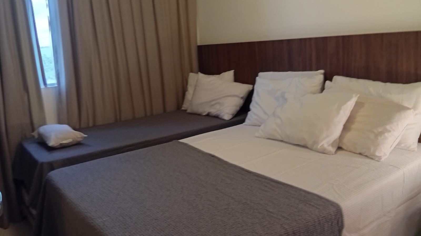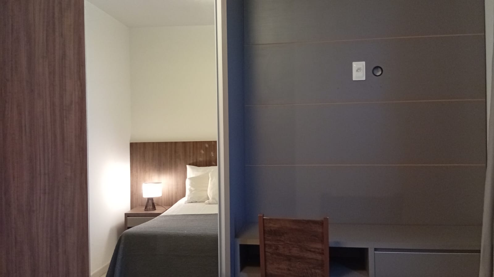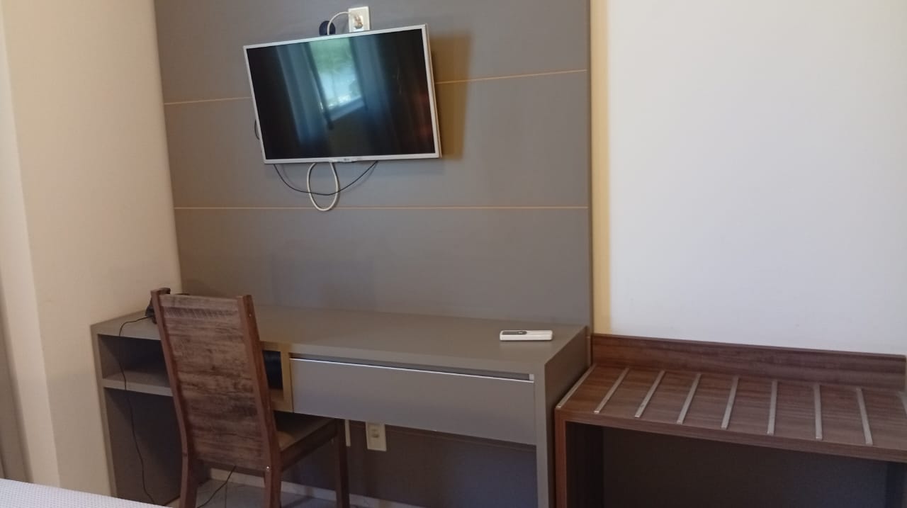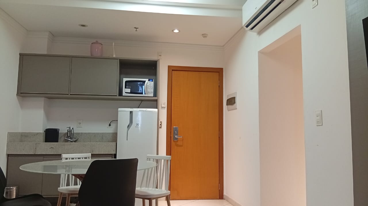 Apartamento com 01 suíte com AE e AR condicionado, bancada para computador, tv de 32 polegadas, cama de casal, 2 criados mudos, abajur, armário de 2 portas com espelho até o teto, 01 dormitório com AE, bancada para computador e tv, cama de casal, 04 colchões de solteiro, cortina com forro, sala com AR condicionado, sofá cama, sofá 02 lugares, cortina com forro, cozinha planejada, mesa com 06 cadeiras, fogão elétrico 02 bocas, geladeira, micro-ondas, pratos, talheres, copos, lixo, wc social com box e espelho, lavanderia, garagem, pintura látex, quintal calçado, teto laje, portas de madeira, janelas em alumínio, murada.
